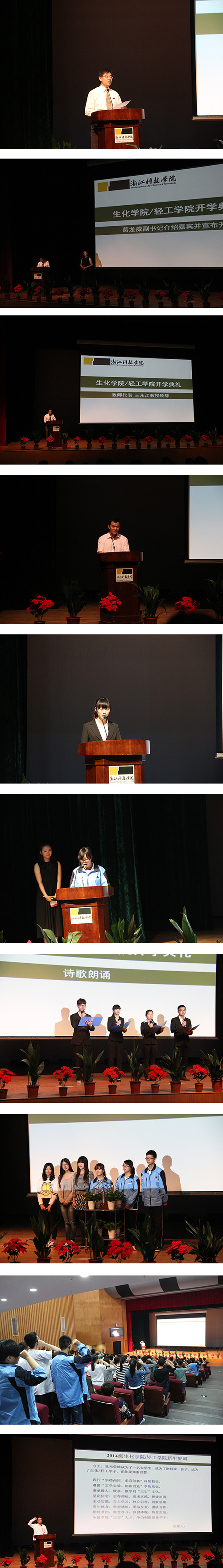 生化/轻工公司2014级新生开学典礼于10月12日13︰30在安吉校区老员工活动中心如期举行。生化/轻工公司经理刘士旺、党总支书记范伟刚、副经理王永江、王立军、副书记葛龙威、办公室主任陈珊飞、原轻工公司经理胡开堂、食品系硕导尤玉如教授等领导出席典礼。应邀出席的还有公司各系系主任、全体辅导员、全体班主任、部分教师代表、优秀员工代表及各员工组织。