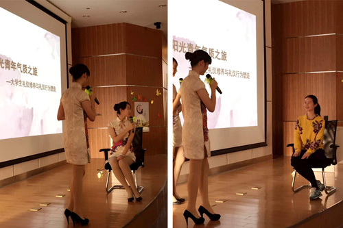 2014年11月23日下午,秀竹书院阳光青年训练营第一讲在中德工程师楼B402举行,3044永利/轻工公司馥雅礼仪协会的学姐们围绕举止、仪表、着装、言谈四个方面展开了一场生动的演讲和趣味的展示。