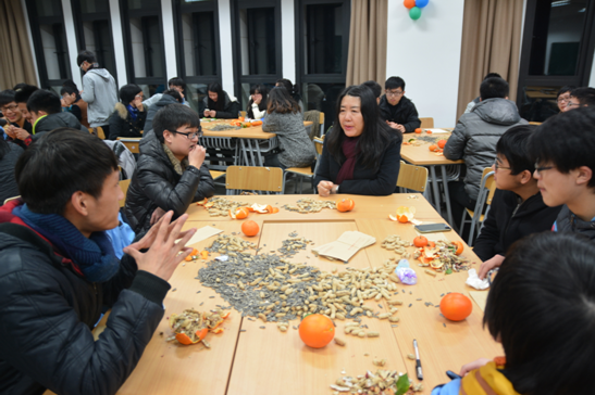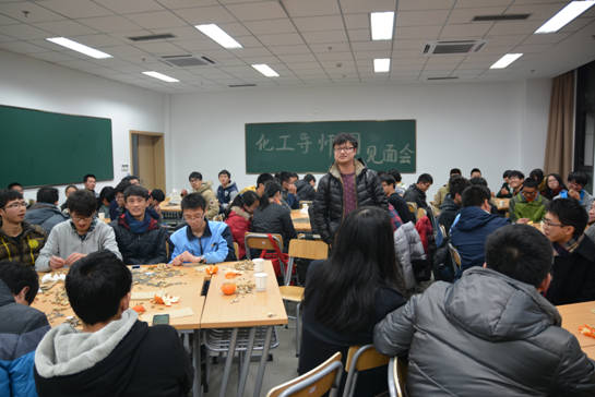 整个团队的成员充分利用了圆桌教室的优势,导师学长们平均分坐到每个员工小组中,为同学们解答关于专业的问题。同学们对化学专业知识的热情和求知欲让他们顾不得害羞或是内敛,都迫不及待地吐出累积在心里许久的问题。每一个或复杂或简单的问题,都有导师们耐心仔细的回复解答。而刚经历过大一的学长学姐们也都很耐心的讲述着自己的学习方式以及成功秘籍,同时还为同学们介绍了一些关于出国发展或者和国企外企合作化工方面项目的条件和奋斗方向。显然临近期末,同学们压力很大,导师们便把课题都放到了寒假,给同学们更充分的复习时间,再有何英洛学长倾情分享宝贵的期末复习经验,众学子受益颇深。虽然本次没有提出课题,讨论依然激烈,期间更有学长和大一同学的献唱,也正是如此有亲和力的画面让整个讨论会持续火热。