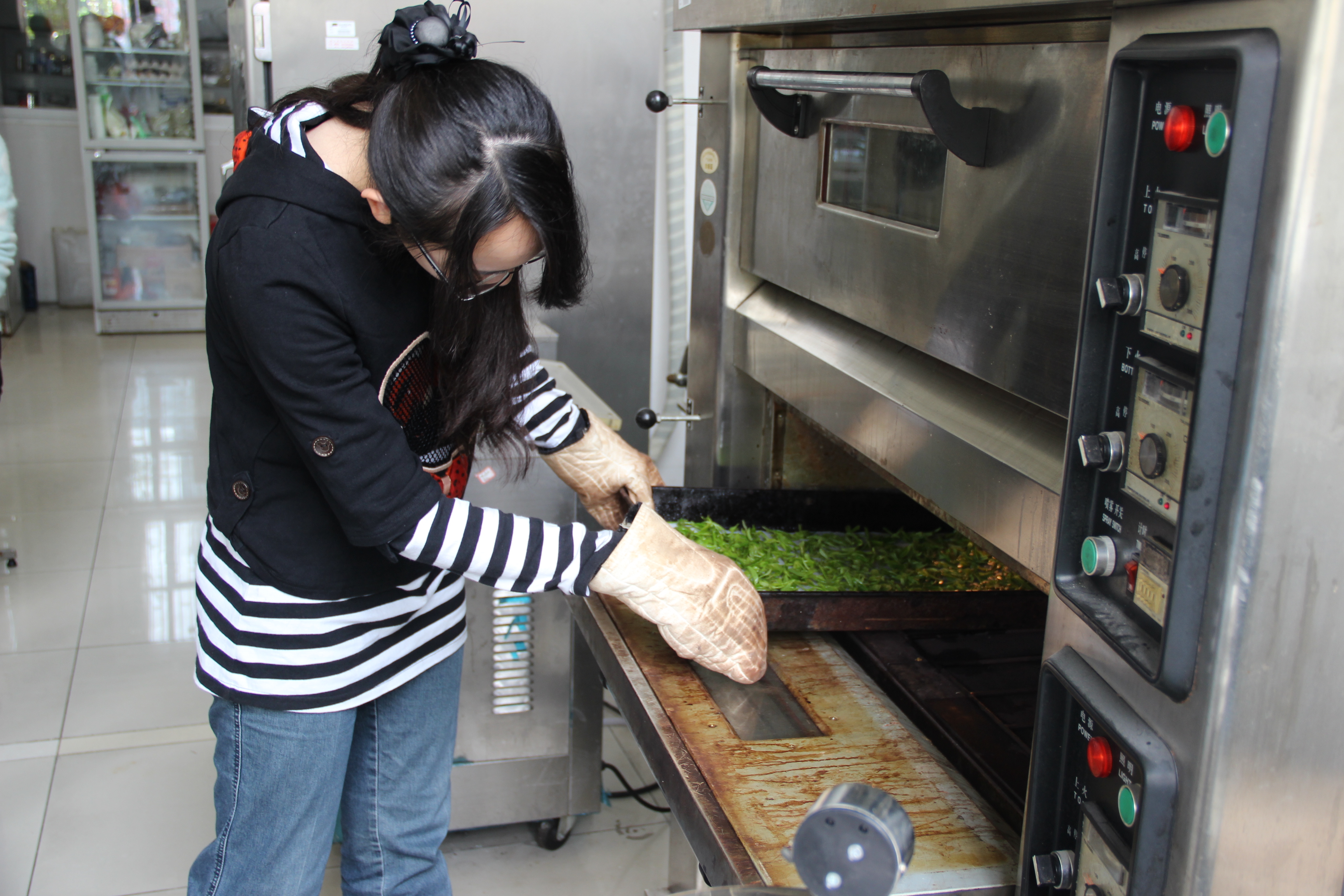 在袁秋萍老师的指导下,同学们井然有序地进行着操作。众所周知,“失水”是茶叶加工的一个重要环节,也是实验室茶叶烘干制作的主要内容。要制作出高品质的茶叶,这必须严格控制干燥条件(温度、风量等)以及干燥速度,也正因如此,传统工业中茶叶的炒制过程才显得尤为重要。而在实验室烘干机的帮助下,同学们十分自如地进行变量的调控。时间一分一秒地过去,浓郁的茶香溢满了整个实验室,大家在茶香中愈加兴致勃勃,丝毫不感疲倦。