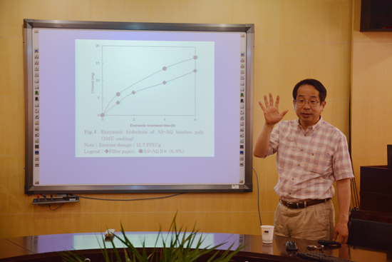 2015年5月10日,日本筑波老员工命环境科学研究科国际地缘开发科学专业主任大井洋教授来访公司2011协同创新中心和省重点实验室,并在三实讲坛作题为“Enzymatic Hydrolysis of Bamboo and Larch Alkaline Sulfite Pulps for Glucose Production(毛竹和落叶松碱性亚硫酸盐浆通过酶降解制取葡萄糖)”的学术报告,公司党委委员、2011协同创新中心主任、省重点实验室主任毛建卫教授以及2011协同创新中心和省重点实验室相关教授博士和研究生参加了报告会,公司副经理王立军主持了报告会。