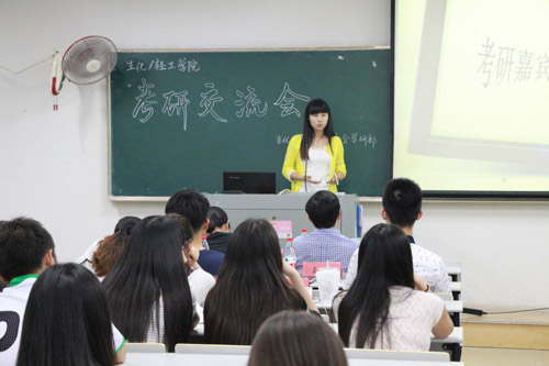 考研成功的学长学姐们就自己的考研经历和心得与在场的同学们进行了交流。王丁一学长以“你为什么要考研?”这个问题为切入点,并通过一份详细的ppt就各科目参考书目、补习班的选择,英语的学习方法,复习计划,课余时间的安排等方面给正在准备考研的学弟学妹们指引了一条明亮的道路。俞灵洁、黄瑜烨学姐在考研心态方面对学弟学妹们进行了开导,她们认为一个良好的心态是考研成功的关键所在,俞灵洁学姐还跟我们一起分享了她准备复试的经历,让在场的每一位都受益匪浅。“考研这条路是不容易,但如果你选择了这条路,那么即使跪着也要走完。”王珏学姐如是说。