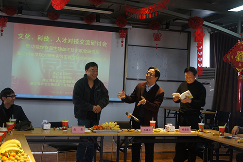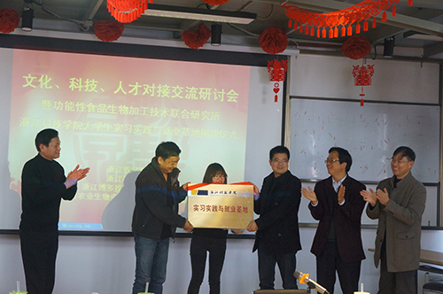 2016年1月19日,公司生化/轻工公司、省农业生物资源协同创新中心和公司党委宣传部、员工工作部师生一行走进杭州博多工贸有限公司, 联合举行了“文化、科技、人才对接交流研讨会暨功能性食品生物加工技术联合研究所、3044永利老员工实习实践与就业基地揭牌仪式”。研讨会由3044永利公司党委委员、省2011协同创新中心主任毛建卫教授主持,浙江省科技厅领导杨春民等嘉宾受邀参加了研讨会,博多工贸集团董事长俞彤、书记王顺成等企业高管一行10余人,公司生化/轻工公司经理、省2011协同创新中心副主任刘士旺教授,员工工作部负责人杨志祥,宣传部副部长葛龙威,生化/轻工公司党委副书记程海丰和宣传部全体老师,生轻公司教授博士、研究生等30余位师生参加了研讨会。