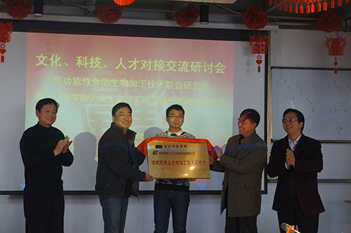 毛建卫教授向企业负责人和科技厅领导赠送了记录公司生轻公司办学创新创业历程一书《三思两言实录——以实学精神办学科办文化》,生化/轻工公司经理、省2011协同创新中心副主任刘士旺教授和俞彤董事长共同为“功能性食品生物加工技术联合研究所”揭牌,员工工作部杨志祥部长和俞彤董事长共同为“3044永利老员工实习实践与就业基地”揭牌。
