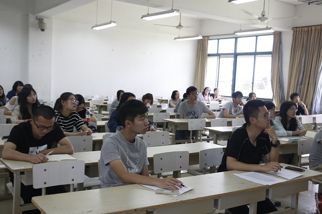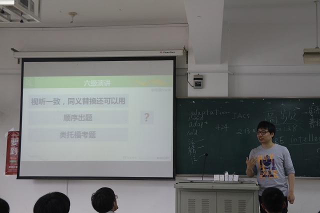 讲座开始,陈曲老师首先把考试的各类题型逐一分析,并把每一栏的总分都列在黑板上。“得听力者得天下,守阅读者守天下”,陈曲老师详细提到了听力的重要性以及听力所占分数所占比例之高。对于阅读,陈老师提出我们需要多背单词,特别是语境中的单词。并提到我们最好准备一本薄而小的重点词汇本,过大的书籍只会增加自己的负担。至于翻译,陈曲老师希望同学们不要漏掉单词,也不要直接放弃,其实很多都可以用简单的词代替。最后,陈曲老师带领同学们简要系统地回顾了前几次四六级的考试题型,并从中总结经验,整个讲座内容丰富,老师分析透彻、阐释深入。期间,同学们认真听讲并做详细的笔记,体现他们积极认真的学习态度。