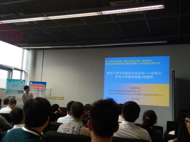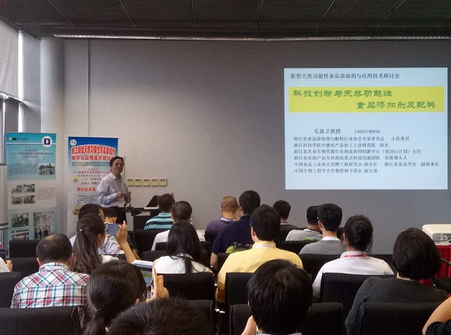 公司党委委员、省2011协同创新中心主任毛建卫教授主持研讨会并作主题报告“科技创新与新型天然功能性食品添加剂的发展”,葛青博士作主题报告“新型天然食用黑色素-竹源植物炭黑”,沙如意博士作主题报告“新型天然多功能食品添加剂-抗氧化、护色与抑菌的植酸/植酸钠”。