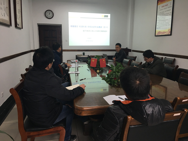 叶春林博士首先向老师们通报了本次校内专业认证专家检查中发现的一些问题,并要求大家按照要求及时整改;接着,结合专业认证培训会谈了对工程教育专业认证的认识;然后由王永江副经理作了题为“基于OBE的工程人才培养方案的设计”的报告。他从专业认证理念、标准着手,着重阐述了专业培养目标、毕业要求、课程体系以及教学大纲如何按照论证标准要求进行设计。