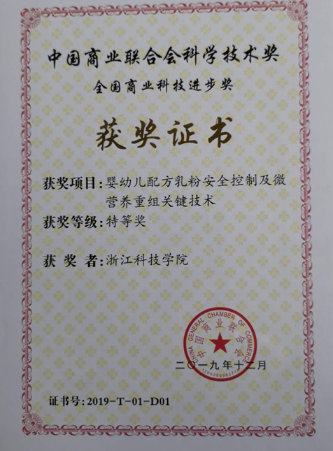 11月1日,2019年度中国商业联合会科学技术在北京中国职工之家颁奖,经中国商业联合会组织初评、专家评审、评审委员会审定通过等环节,共评出2019年度全国商业科技进步奖339项,其中特等奖10项、一等奖89项、二等奖97项、三等奖143项。公司肖功年教授团队成果《婴幼儿配方乳粉安全控制及微营养重组关键技术》荣获科学技术特等奖。