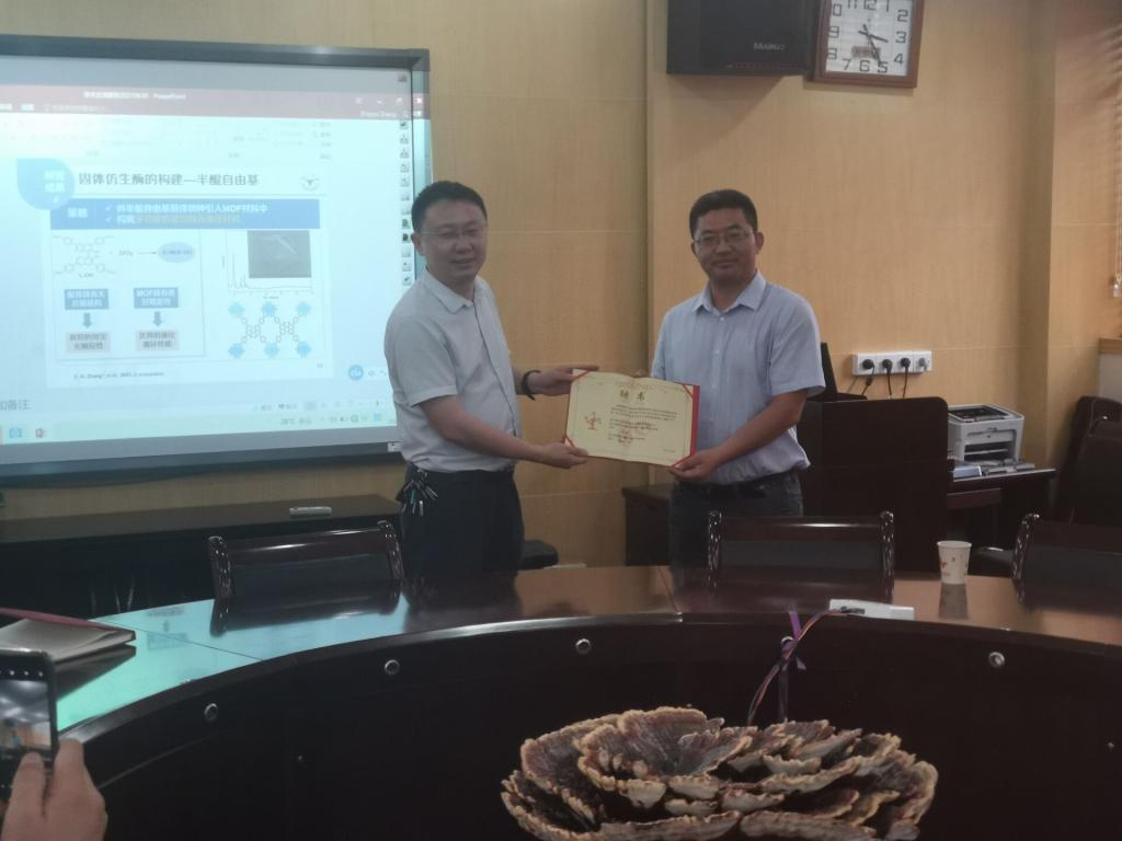 张治国教授在报告中介绍了微纳结构有机分子催化剂的构筑策略、催化机理、构效关系及在医药关键中间体高效、高选择性制备中的应用。参加报告的师生兴趣浓厚,并就报告相关主题与张教授进行了广泛深入的交流与探讨,现场气氛热烈。报告结束后,黄经理为张治国教授颁发了客座教授聘书。