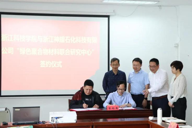 会议上,公司党委与中共建德市科学技术局机关支部委员会签订了党建联盟协议,公司与浙江神耀石化科技有限公司共建“绿色聚合物材料联合研究中心”正式签约。