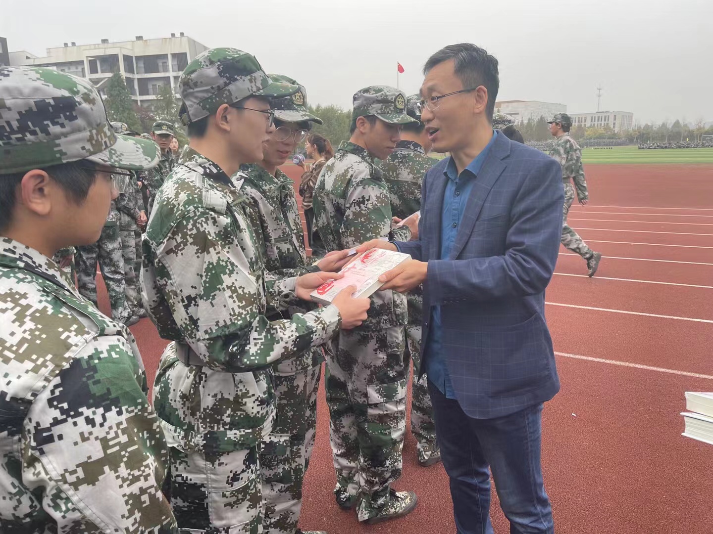路胜利代表公司党政领导表达了对参训员工的关心,鼓励员工发扬严守纪律、吃苦耐劳的精神,展现严谨认真的训练作风和积极向上的精神风貌,以高标准、严要求完成军训任务。同时,他提醒同学们注意身体防寒保暖,共同做好疫情防护工作,向教官们的辛勤付出表示慰问和感谢!最后,路胜利和班主任向每个新生班级送出8本好书,班主任在每本书上都写下了新生寄语,鼓励新生要牢记历史使命,不断艰苦奋斗。