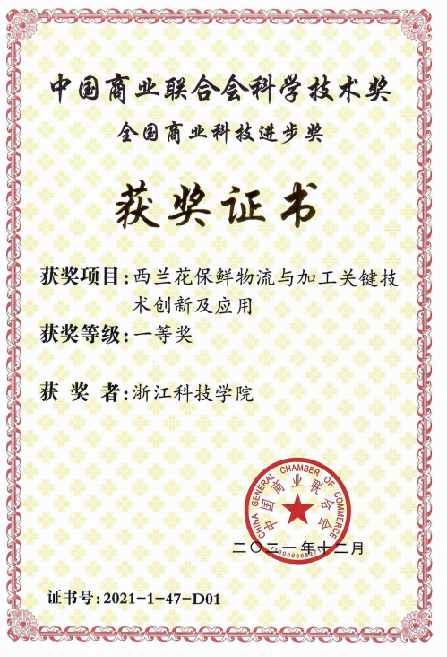 2022年5月28日,中国商业联合会主办的2022年全国商业科技质量大会在北京召开。公司吴元锋教授主持申报的“西兰花保鲜物流与加工关键技术创新及应用”获中国商业联合会科学技术奖一等奖。