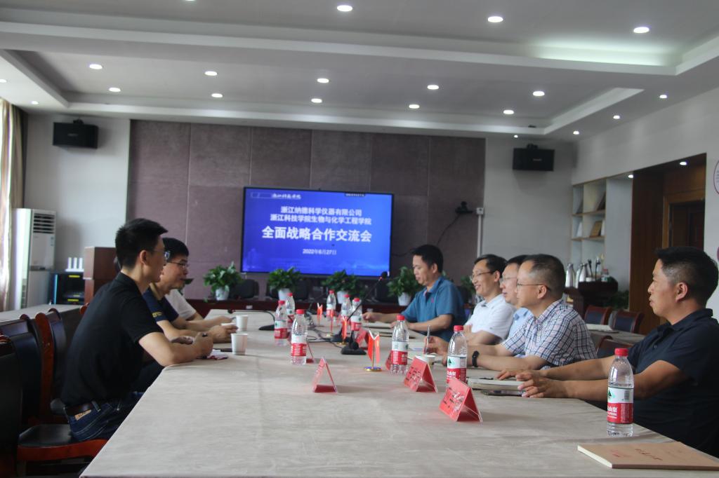2022年6月28日下午14:00,浙江纳德科学仪器有限公司邱耀彰董事长一行来院开展全面战略合作交流。公司经理黄俊、党委书记路胜利等公司党政班子成员,生物工程系主任、实验中心主任等参加了交流会。交流会主要围绕如何开展院企合作进行了深入讨论。
