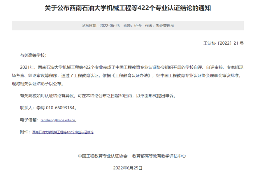 近日,中国工程教育专业认证协会正式公布《关于公布西南石油大学机械工程等422个专业认证结论的通知》(工认协〔2022〕21 号)。公司制药工程专业顺利通过认证,有效期为6年(2022年1月至2027年12月)。