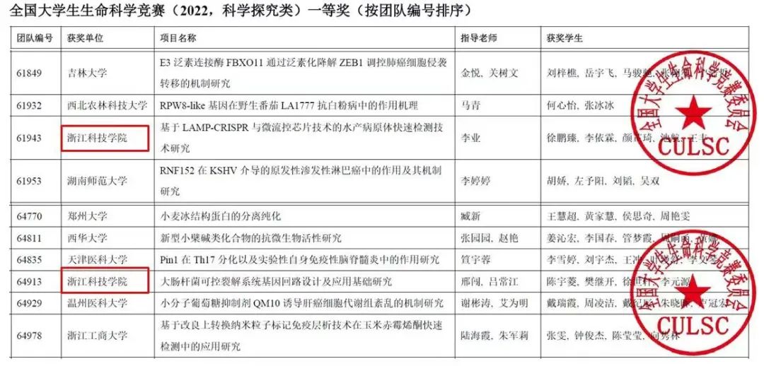 3044永利两支队伍(“大肠杆菌可控裂解系统基因回路设计及应用基础研究”,组员:陈宇菱、李元源、樊继开、徐世轩,指导教师:邢闯、吕常江;“基于LAMP-CRISPR与微流控芯片技术的水产病原体快速检测技术研究”,组员:徐鹏臻、李依霖、颜芷琦、池航、王丰,指导教师:李业)突出重围、进入决赛,并斩获全国一等奖,这是公司学子参加此项竞赛获得的历届最好成绩。