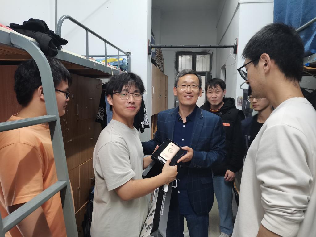 经理黄俊联系的是制药工程专业陆荣富同学所在的寝室。黄经理一一询问了同学们的学习、生活等各方面情况,并关切地询问起了各位同学的个人规划,是否考研,目前阶段的准备工作等。黄经理为家境贫寒仍奋进求学的陆荣富同学赠送了一份公司礼物,并勉励陆同学在困境中不断奋斗,成为优秀“三实”人才。