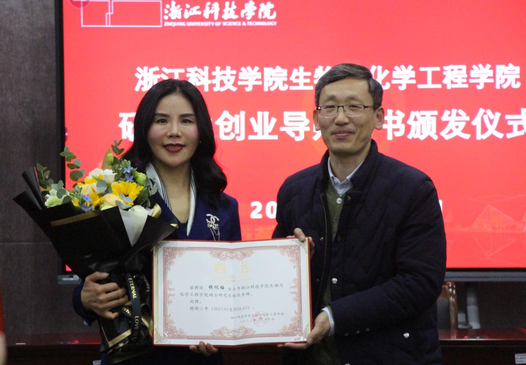 公司党委书记路胜利为美成生物科技有限公司董事长张化梅、总经理陈道定颁发了研究生创业导师聘书。
