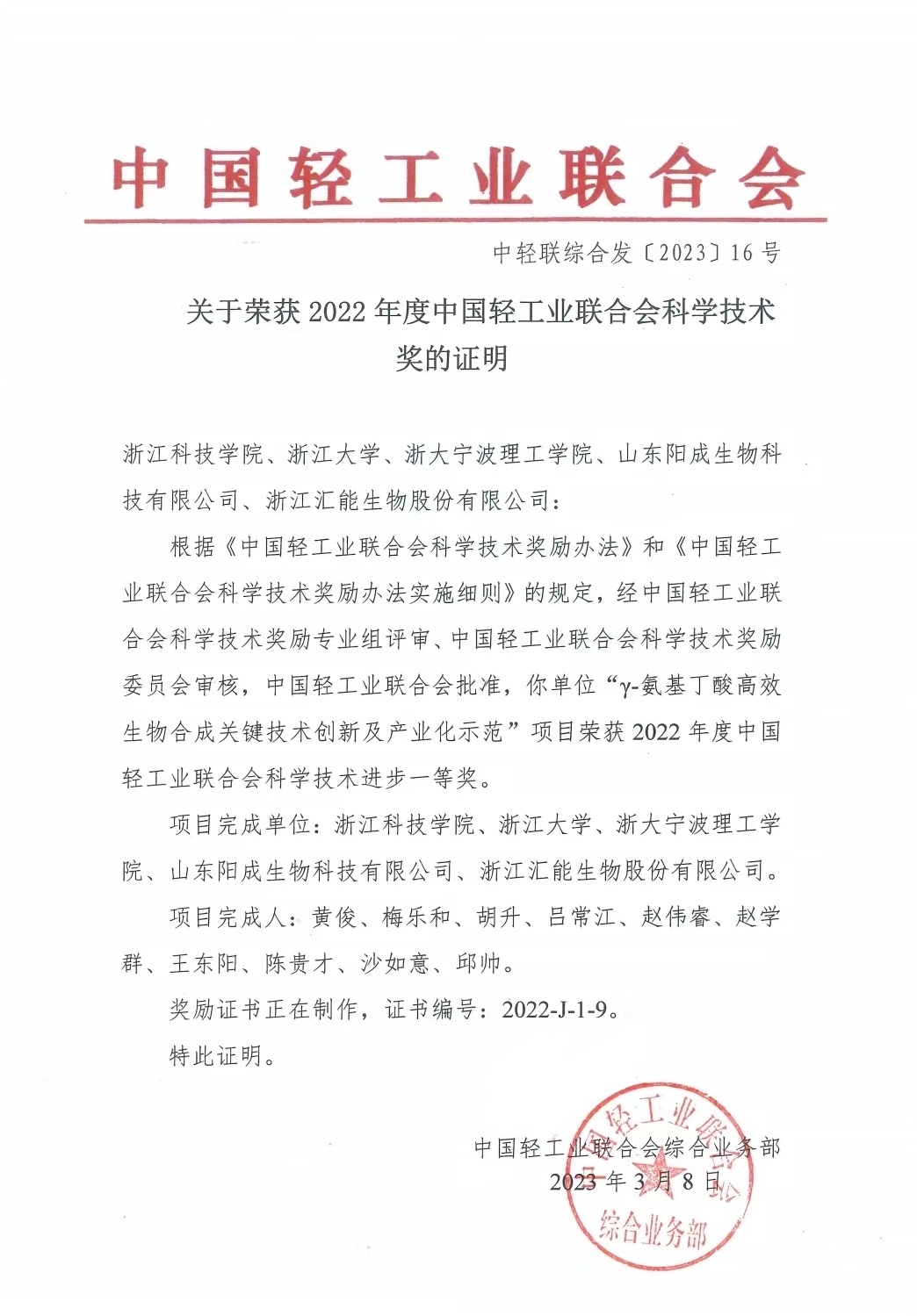 近日,2022年度中国轻工业联合会科技进步奖揭晓,由公司经理黄俊教授主持申报的“γ-氨基丁酸高效生物合成关键技术创新及产业化示范”项目获得科技进步一等奖。该项目由3044永利、浙江大学、浙大宁波理工公司、山东阳成生物科技有限公司与浙江汇能生物股份有限公司共同完成。公司吕常江副教授、陈贵才教授、沙如意副教授和邱帅博士为该成果重要参与人。