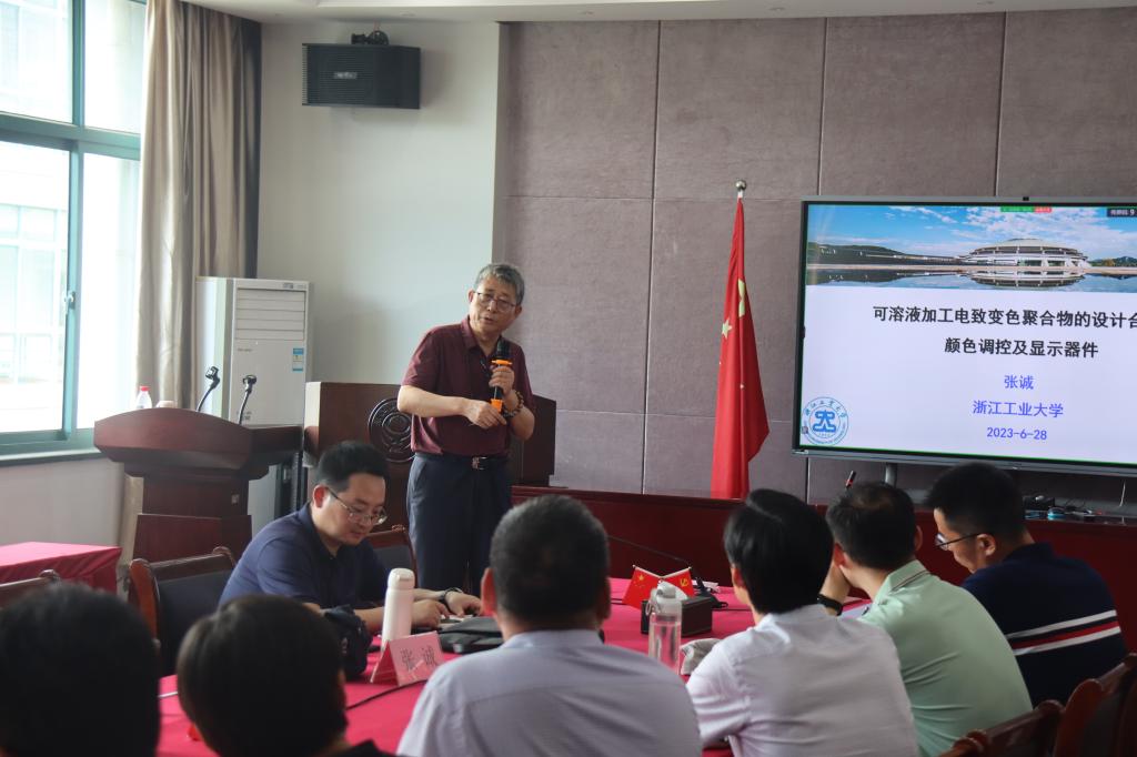 受聘和授牌仪式后,张诚教授主讲了学术报告“可溶液加工电致变色聚合物的设计合成、颜色调控及显示器件”。报告中,张教授围绕PEC材料分子结构设计、PEC薄膜的特殊处理、利用叠层复合技术实现多种颜色精确调控、水溶性CMY材料和水分散型PEC油墨可喷涂/喷墨打印,利用三基色PEC溶液共混实现颜色调控,并设计组装军事防伪、智能眼镜、精密显示等领域PEC显示器件等科研内容进行详细讲解,使与会老师及员工深入领略了电致变色材料的研究发展趋势及应用前景。随后,现场的老师同学与张教授进行了热烈的讨论。