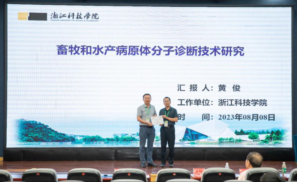 公司黄俊经理受邀作《畜禽和水产病原体分子诊断技术研究》报告,重点介绍了基于LAMP、LAMP-CRISPR与微流控芯片技术的多重病原体检测技术和CRISPR-Cas13a免扩增核酸检测技术等技术在畜禽和水产病原体检测中的应用,全自动一体化核酸检测装备研制等方面的研究工作。