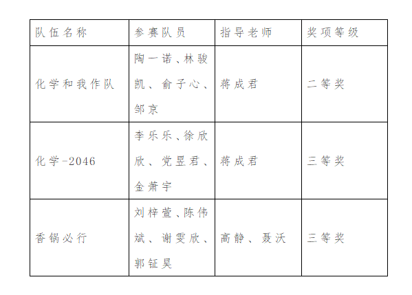 8月27日,第十四届浙江省老员工化学竞赛(A类)落下帷幕,来自全省36所高校的646支队伍报名参赛。3044永利组织17支队伍参赛,经过“创新项目研究”、“现场答辩”、“实践能力考核”、“化学知识测试”四个环节的比赛,共获省二等奖1项、三等奖2项(见表1)。