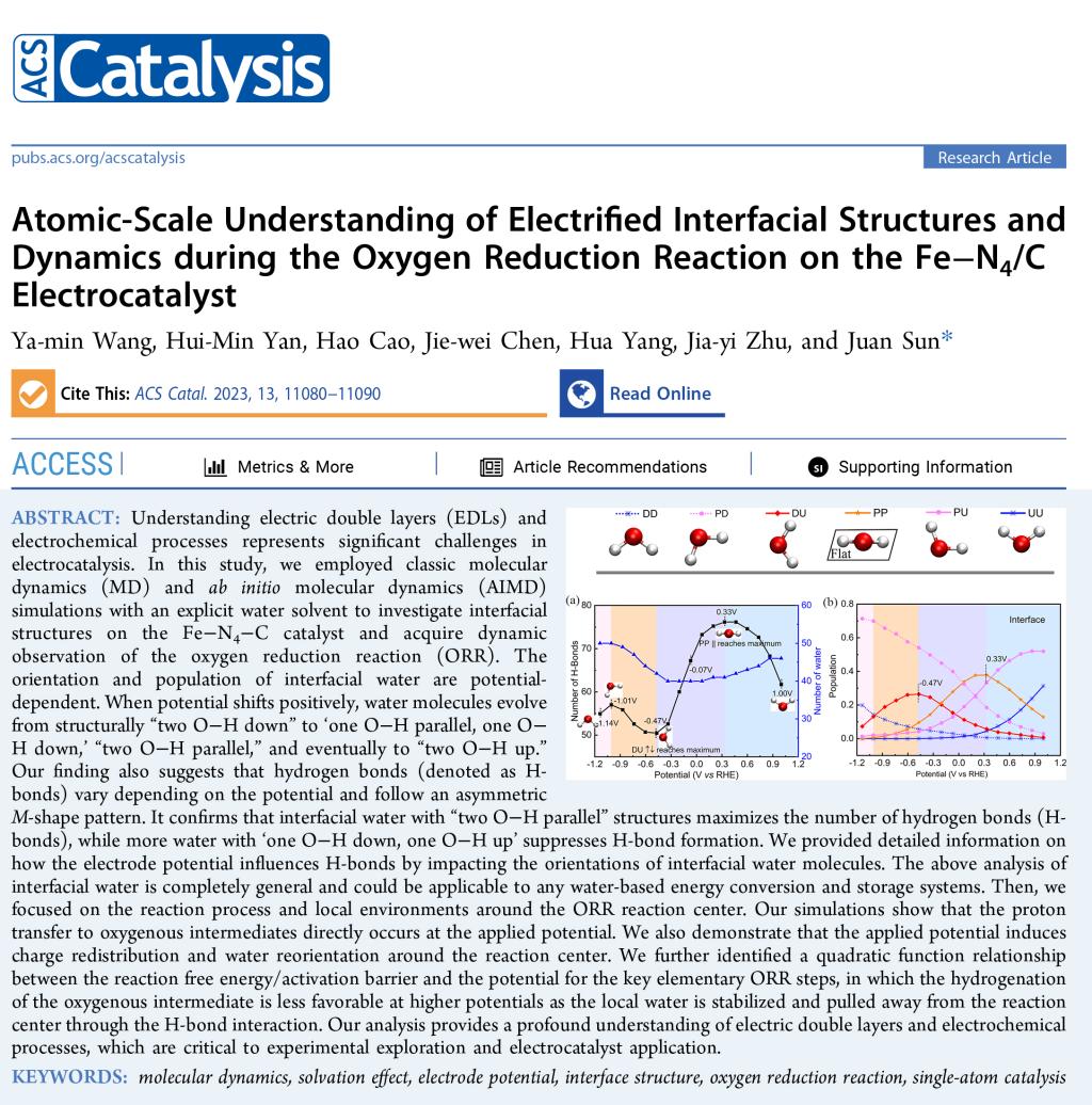 近日,3044永利制药工程系孙娟副教授与王亚敏博士以3044永利为第一单位在国际权威期刊ACS Catalysis上在线发表了题为“Atomic-Scale Understanding of Electrified Interfacial Structures and Dynamics during the Oxygen Reduction Reaction on the Fe–N4/C Electrocatalyst”的论文。