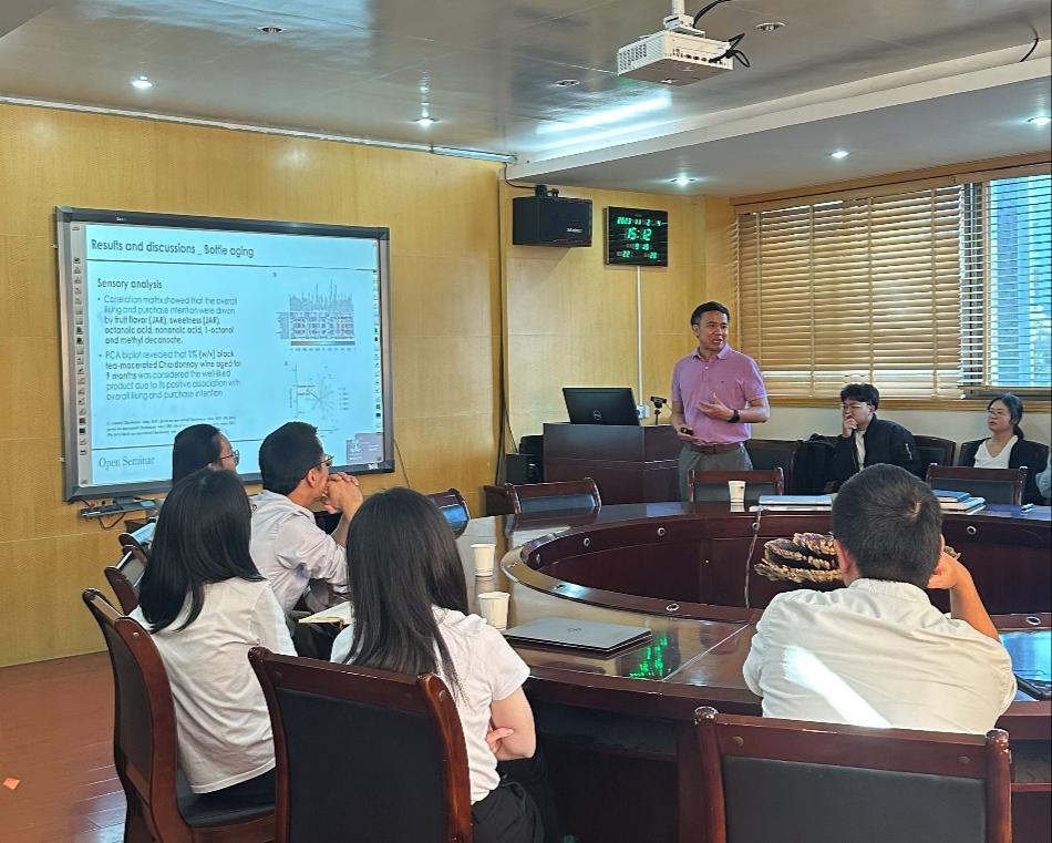 报告会上,方博士以《Pulsed electric field processing and bottle aging on the quality of tea-infused chardonnay wine》为题,将澳大利亚葡萄酒与我国茶融合开发了茶风味葡萄酒,围绕葡萄酒酿造、茶的品质风味检测、脉冲电场技术、滋味解析、成分鉴别、功能评价等方面给公司师生进行学术分享,并与公司师生从农产品加工先进技术、功能活性评价新方法、科研创新思路开拓等方面进行了深层次学术交流,气氛热烈。最后,方博士还对墨尔本大学的建校历史、人文、留学政策等进行了介绍。
