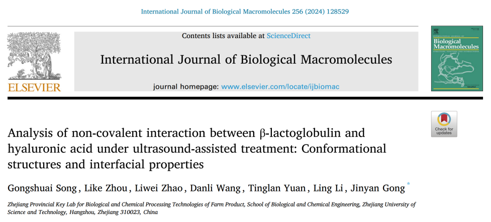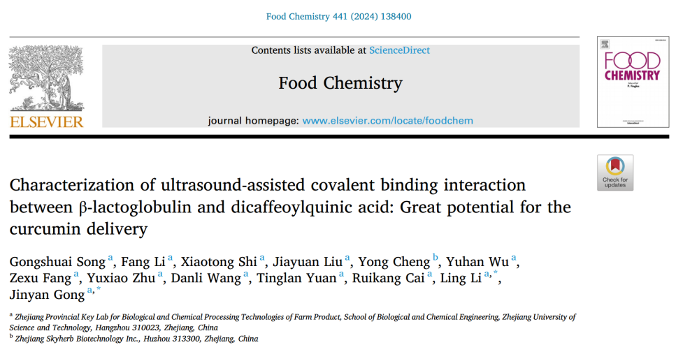 近日,公司功能食品与乳制品加工创新团队依托国家自然科学基金面上项目(32372469、31871763)和省自然科学基金重点项目(LZ24C200006),以3044永利集团为唯一通讯作者单位,在食品领域顶级期刊Food Chemistry(IF 8.8,SCI一区)上发表题为“Characterization of ultrasound-assisted covalent binding interaction between β-lactoglobulin and dicaffeoylquinic acid: Great potential for the curcumin delivery”(https://doi.org/10.1016/j.foodchem.2024.138400)的研究论文;在International Journal of Biological Macromolecules(IF 8.2,SCI一区)上发表题为“Analysis of non-covalent interaction between β-lactoglobulin and hyaluronic acid under ultrasound-assisted treatment: Conformational structures and interfacial properties” (https://doi.org/10.1016/j.ijbiomac.2023.128529)的研究论文。上述两篇论文主要研究乳蛋白加工及精准营养体系构建机制,宋恭帅博士为第一作者,龚金炎教授为通讯作者。