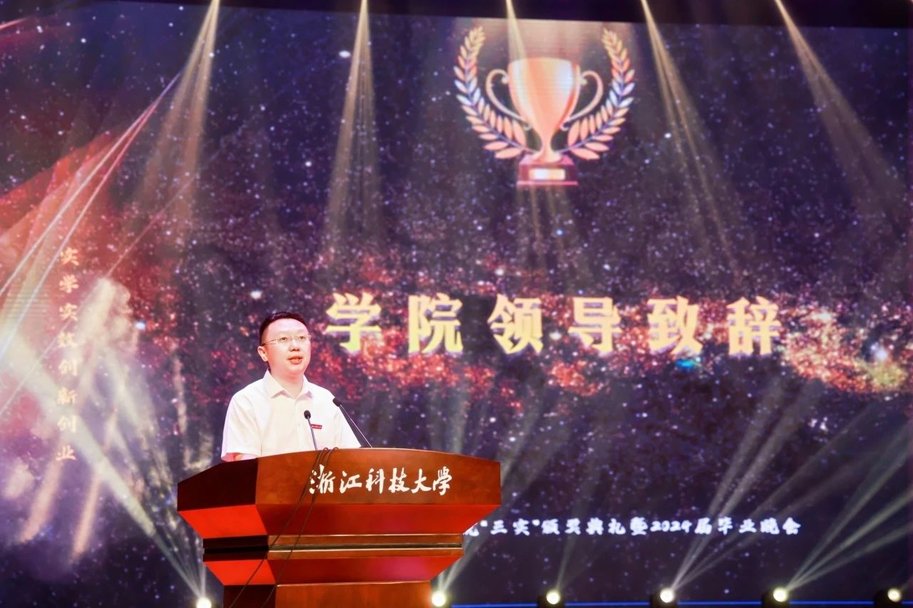 教师代表张金柯老师表达了获得“三实”之星(社会服务奖)的感言,并从“崇德”、“尚用”、“求真”、“创新”四个方面对毕业生提出了4点期望,祝福大家在未来的道路上越走越宽广,越走越精彩。