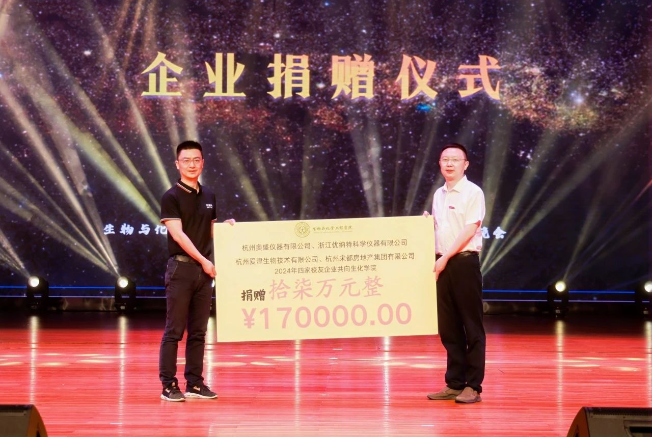 奥盛仪器有限公司,浙江优纳特科学仪器有限公司,浙江爱津生物技术有限公司,宋都集团为支持三实人才的培养,于2024年共计捐赠人民币17万元整!企业代表优纳特陈斌先生介绍了公司的研究方向和发展规划,分享了在人才培养,科研联攻等方面的合作情况,表达了对获奖师生,对公司、公司发展成就的祝贺,希望接下来能进一步加强校企合作的广度与深度。