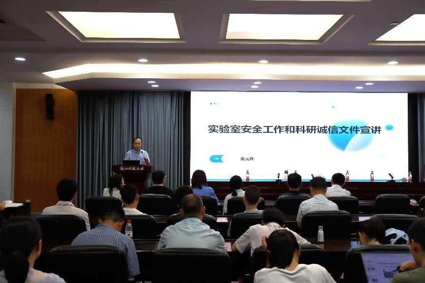 副经理吴元锋围绕实验室安全和科研诚信教育进行了发言,提醒全体教师守牢实验室“安全底线”和科研“诚信底线”。