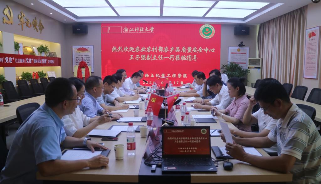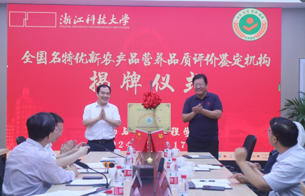 2024年7月17日,农业农村部农产品质量安全中心王子强副主任和优质农产品发展处处长一行到公司调研全国名特优新农产品营养品质评价鉴定工作,浙江省农业农村厅二级巡视员费建庆、浙江省农产品绿色发展中心主任章颖逸等陪同调研。公司梁荣华副董事长对王子强副主任一行表示热烈欢迎,并向调研组介绍了公司学科发展现状,梁荣华副董事长表示公司将对全国名特优新农产品营养品质评价鉴定工作从人员配置和硬件提升进行全面支持。调研会上,王子强副主任与梁董事长共同为“全国名特优新农产品营养品质评价鉴定机构”揭牌。