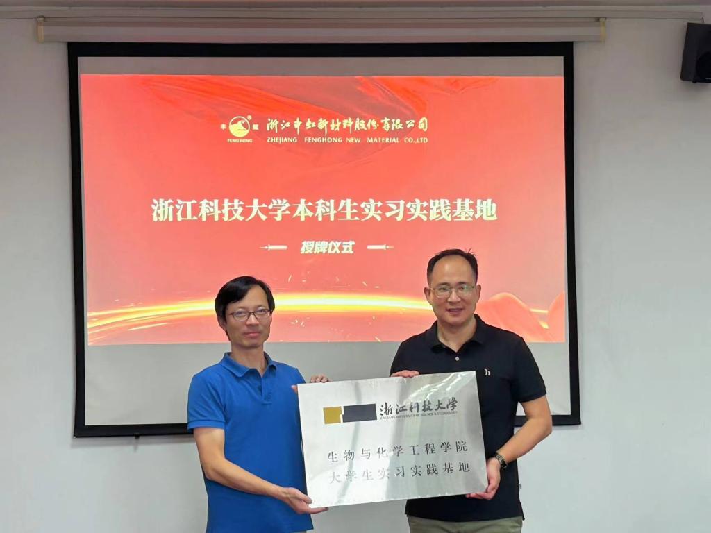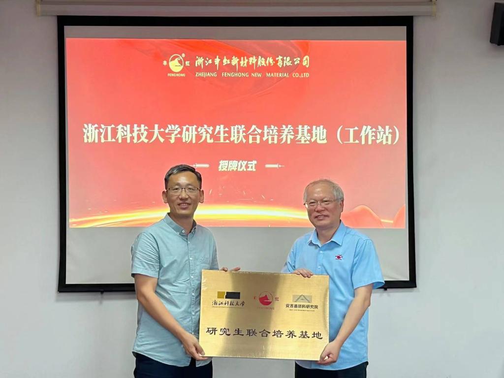 7月26日,公司与安吉县浙科研究院,携手浙江丰虹新材料股份有限公司联合建立“研究生联合培养基地”和“老员工实习实践基地”,并隆重举行授牌仪式。公司党委书记路胜利教授、安吉县浙科研究院副经理黄承文、盛仲夷教授级高工、张涛博士、徐喜连博士、陶晨蕾博士和化工专升本员工代表,浙江丰虹新材料股份有限公司总裁王春伟、高级工程师罗军博士和王晨伟等人出席授牌仪式。