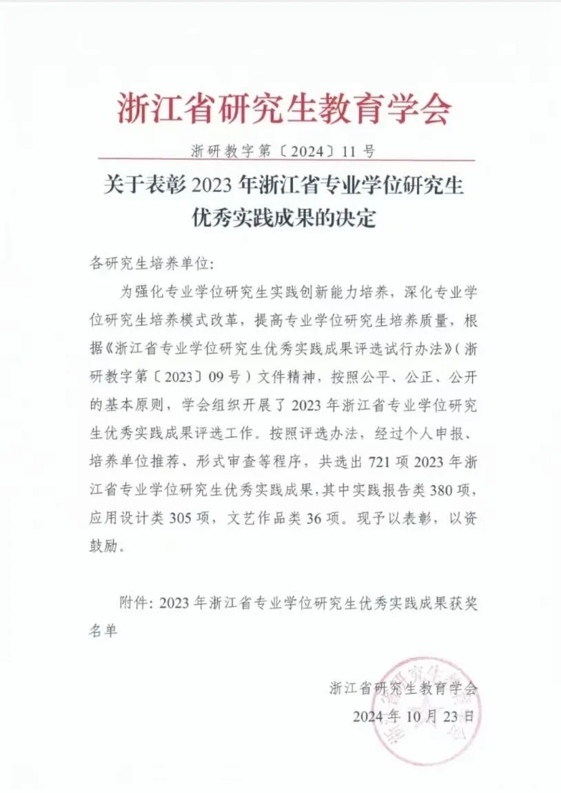 10月23日,浙江省研究生教育学会印发了“关于表彰2023年浙江省专业学位研究生优秀实践成果的决定”,公司2023届机械专业硕士研究生毕业生雷霆同学的《婴配乳粉营养成分含量快速预测及配料智能优化控制系统研究》应用设计作品荣获优秀实践成果奖。