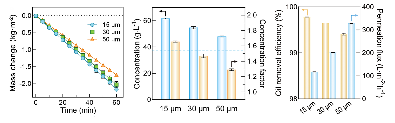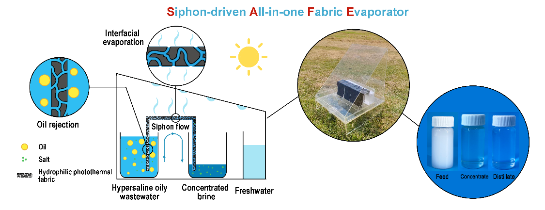 工业高盐含油废水因其成分复杂、处理难度大,一直是环境治理领域的一大难题。传统处理技术,如反渗透、膜蒸馏等,常面临膜污染以及盐分回收困难等瓶颈。生物催化与分子诊断研究团队创新性地开发出一种耦合单向虹吸流动与太阳能驱动蒸发的一体化纤维蒸发器(SAFE),巧妙集成截留、蒸发与浓缩过程,实现了高盐含油废水中油、水与盐的高效分离与资源化回收,为工业废水处理提供了极具潜力的创新解决方案。本研究通过贻贝仿生沉积技术,制备出兼具优异亲水疏油特性和高效光热转换能力的亲水光热纤维膜。纤维膜利用其优异的亲水性实现对油滴的有效截留,并通过虹吸效应实现盐溶液在纤维内的自发、定向传输。在太阳光驱动下,水分快速蒸发并经冷凝后回收得到清洁淡水。与此同时,浓缩后的盐水在纤维出口端被及时导出,此设计有效抑制了盐分结晶对蒸发过程的阻碍问题,进而实现了高效、持续的蒸发性能。实验结果表明,SAFE系统展现出卓越的蒸发效率和油水分离能力。在一个太阳光照下,SAFE蒸发速率可达2.19 kg·m-2 h-1,盐分浓缩1.57倍,油水分离效率突破99.8%,户外实验也进一步证实了其优异的抗污性和长期稳定性。
