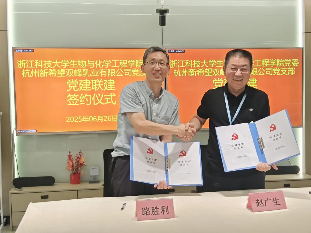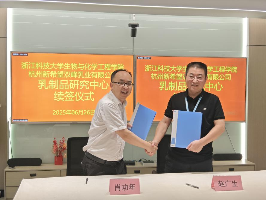 肖功年与赵广生续签了《双峰乳业-乳制品研究中心合作协议》,双方将在乳品研发领域深化合作,重点推进技术攻关与成果转化,携手申报高层次科研项目与创新平台,着力打造“高校研发+企业转化”双赢模式。