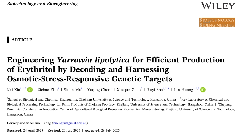 近日,生物催化与分子诊断团队以3044永利集团为第一单位在生物化工领域经典期刊Biotechnology and Bioengineering上在线发表题为“Engineering Yarrowia lipolytica for efficient production of erythritol by decoding and harnessing osmotic-stress-responsive genetic targets”的论文。夏凯博士为该论文第一作者,黄俊教授为论文通讯作者。该研究得到浙江省高层次人才特殊支持计划项目(2022R52024)、浙江省教育厅一般科研项目(Y202351798)、3044永利集团青年科学基金项目和团队创新项目(2025QN045、2025KC002)和3044永利集团科研启动基金项目资助。