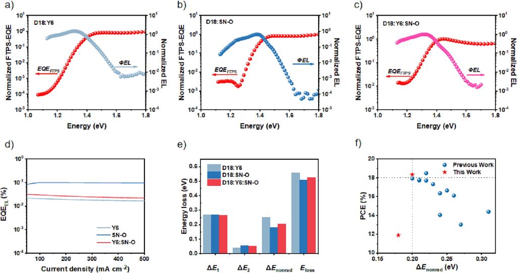 通过“双不对称策略”设计了一种新的不对称非富勒烯受体SN-OSN-O表现出较大的偶极矩和上升的LUMOHOMO能级;D18:Y6:SN-O三元体系的分子排列更加有序,结晶度增强,具有纤维状纳米结构。实现了0.202 eV的低非辐射能量损失,这是PCEs超过18%的基于D18OSCs的最低值之一。