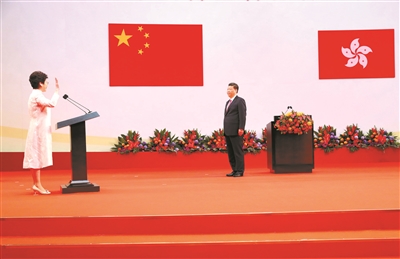 在热烈的掌声中,习近平发表了重要讲话。他指出,香港的命运从来同祖国紧密相连。近代以后,由于封建统治腐败、国力衰弱,中华民族陷入深重苦难。只有当中国共产党领导中国人民经过艰苦卓绝的奋斗赢得民族独立和解放、建立新中国之后,中国人民才真正站立起来,并探索开辟出一条中国特色社会主义光明道路。在改革开放的历史条件和时代背景下,邓小平先生提出了“一国两制”伟大构想,并以此为指引,通过同英国的外交谈判,顺利解决了历史遗留的香港问题。香港回到祖国的怀抱,洗刷了民族百年耻辱,完成了实现祖国完全统一的重要一步。香港回归祖国是彪炳中华民族史册的千秋功业,香港从此走上同祖国共同发展、永不分离的宽广道路。
