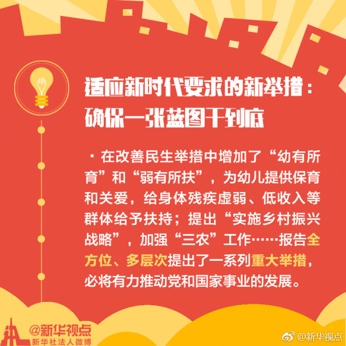 在改善民生举措中增加了“幼有所育”和“弱有所扶”,为幼儿提供保育和关爱,给身体残疾虚弱、低收入等群体给予扶持;提出“实施乡村振兴战略”,加强“三农”工作……报告全方位、多层次提出了一系列重大举措,必将有力推动党和国家事业的发展。