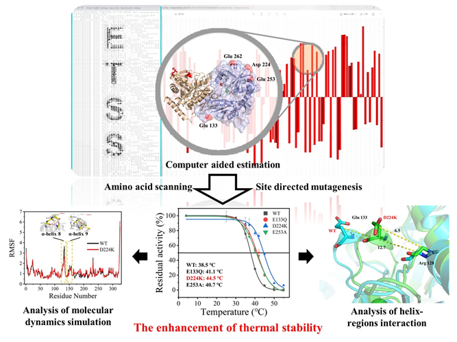 公司黄俊教授课题组以土曲霉(Aspergillus terreus) (R)-ω-转氨酶为研究对象,一方面利用酶热稳定性系统(ETSS)鉴定了位于转氨酶表面的4个重要残基位点,根据残基带电相反的原则,通过定点突变,获得了3个热稳定性明显提高的突变体。另一方面根据之前实验获得的3个与L118位点具有强相互作用的残基为进化突变位点,获得了热稳定性明显提高的双突变体F115L-L118T。进一步通过分子动力学模拟,阐述了突变体的热稳定性提高机制。研究内容分别发表在Biochemical Engineering Journal(2021, 167: 107926)和Frontiers in Chemistry(2021, 9: 664156),同时获得授权中国发明专利2项(专利号:ZL201810619322.2、ZL201910343331.8)。