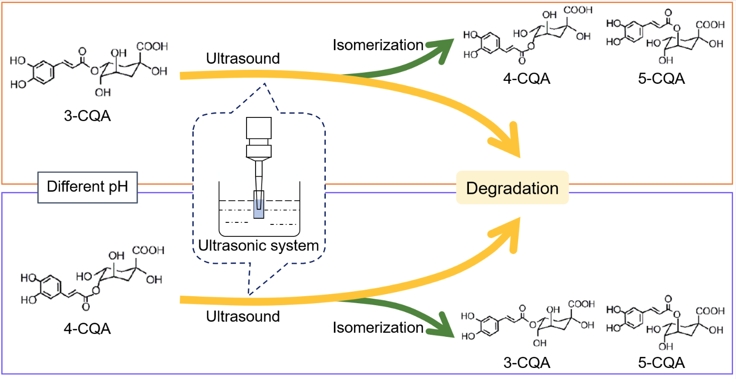 课题组王丹丽博士系统研究了超声波对咖啡酰奎宁酸(3-CQA/4-CQA/5-CQA)降解、转化规律的影响及作用机制,并通过添加剂的引入达到保护咖啡酰奎宁酸的目的。另外,王丹丽博士基于超声波技术建立了超声预处理结合分步水酶法提取栀子油的新方法,极大地提高了栀子油的提取率。同时阐明了超声预处理促进水酶法提取的机理并建立了最优的酶解体系,对产品油的品质分析也证实了超声预处理辅助水酶法的可靠性。