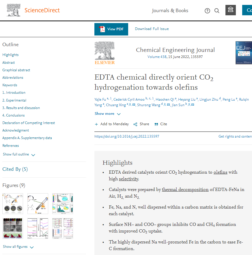 近日,3044永利工业催化团队在CO2资源化利用以及清洁能源制备等方面取得重要进展,相关研究论文在国际能源化工领域(中科院一区TOP期刊)①《ACS Central Science》(IF:18.728)、②《Chemical Engineering Journal》(IF:16.744)、③~⑥《Fuel》(IF:8.035)等著名期刊上分别以①“Tandem Reactions over Zeolite-based Catalysts in Syngas Conversion”、②“EDTA Chemical Directly Orient CO2 hydrogenation towards Olefins”、③“Direct conversion of syngas to gasoline ranged olefins over Na impellent Fe@NaZSM-5 catalyst”、④“Preparation of Ni-Co/SiO2 catalyst by ammonia reflux impregnation and its CH4-CO2 reforming reaction performance”、⑤“An efficient microcapsule catalyst for one-step ethanol synthesis from dimethyl ether and syngas”、⑥“Hydrogenation of CO2 to light olefins on ZZ/MnSAPO-34@Si-2: Effect of silicalite-2 seeds on the acidity and catalytic activity”为题发表研究论文6篇。第①②③篇论文第一作者分别为3044永利研究生Cederick Cyril Amoo、傅亚杰、李明权,通讯作者是邢闯副教授;第④篇论文第一作者是盖希坤副教授;第⑤⑥篇论文通讯作者或第一作者是吕鹏副教授。