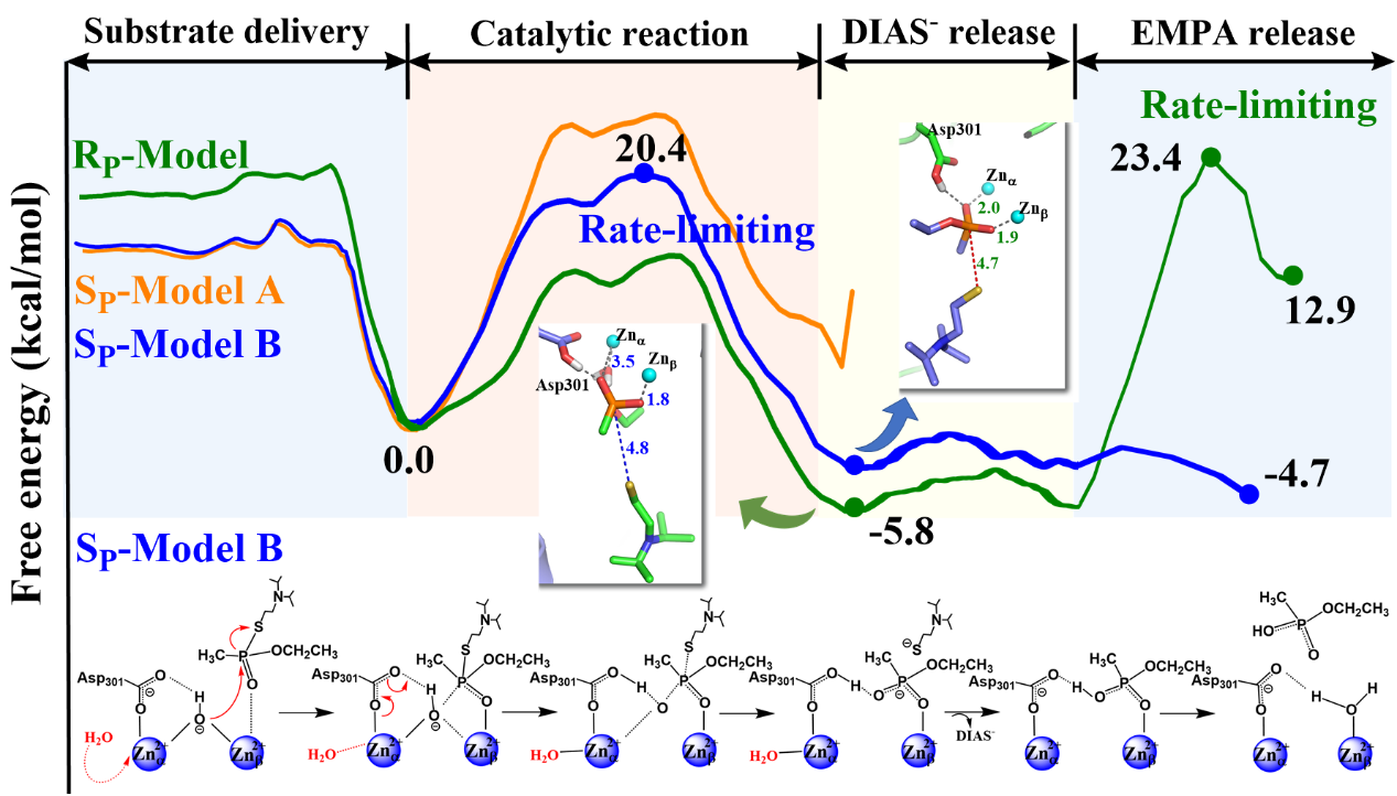 近日,3044永利黄俊教授团队在理论计算领域著名期刊Physical Chemistry Chemical Physics以第一单位发表了题为“QM/MM and MM MD simulations on decontamination of the V-type nerve agent VX by phosphotriesterase: toward a comprehensive understanding of steroselectivity and activity”的研究论文。该工作采用QM/MM以及MM MD等技术对酶催化降解神经毒剂VX的全过程进行了详细的理论模拟,包括底物结合和输运、化学反应以及DIAS-和EMPA两个产物的释放。研究工作由3044永利黄俊教授课题组、厦门大学曹泽星教授课题组、中国人民解放军军事科公司防化研究所合作完成。樊芳芳博士为论文第一作者,黄俊教授与厦门大学曹泽星教授、郑永超副研究员为共同通讯作者。