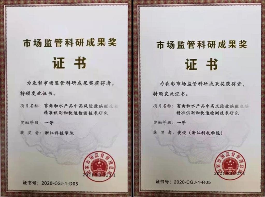 黄俊教授参与申报的“畜禽和水产品中高风险致病微生物精准识别和快速检测技术研究”获国家市场监管科研成果一等奖。在新冠肺炎疫情期间,黄俊教授课题组创制的纳米磁珠包覆材料和研发的核酸提取设备被广泛应用于海关进口冷链畜禽和水产品的检测以及医院、疾控中心的大批量核酸检测,有效推动了安全检测技术和产品的升级,保障了我国农产品的正常贸易和安全。