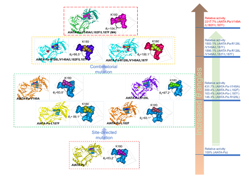 西那卡塞是拟钙剂的新一类化合物中第一个药物,用于治疗进行透析的慢性肾病患者的继发性甲状旁腺功能亢进症等疾病。(R)-(+)-1(1-萘基)乙胺作为主要的药效基团,其合成方式广受关注。酶催化策略具有对反应选择性控制(立体、区域、化学)和绿色环保的优势,越来越受到人们的重视。然而,酶的低活性和低稳定性大大地限制了其非天然的化学转化。针对上述关键问题,研究团队从来源于土曲霉属的ω-转氨酶(AtATA)出发,通过分析底物大、小结合口袋的张合程度、疏水性以及二聚体界面处的相互作用力,结合酶的定向进化及晶体结构分析,鉴定了AtATA活性与稳定性同步进化的“结构开关”,获得具有鲁棒性的AtATA突变体,并可高效合成西那卡塞手性胺前体(R)-(+)-1(1-萘基)乙胺。该文提出了一种创制活性与稳定性共进化的新技术,并进一步在其他来源的3种转氨酶上进行了验证。