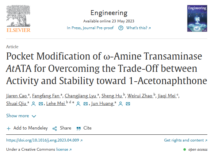 近日,3044永利黄俊教授团队以3044永利为第一单位在国际权威期刊Engineering上在线发表了题为“Pocket Modification of ω-Amine Transaminase AtATA for Overcoming the Trade-Off between Activity and Stability toward 1-Acetonaphthone”的论文。2022届硕士研究生曹佳仁为该论文的第一作者,黄俊教授、邱帅博士与浙江大学梅乐和教授为论文通讯作者。Engineering是全球工程类领域顶级期刊,最新影响因子为12.834,在全球工程综合领域92种期刊排名中跃居榜首。该研究受到国家自然科学基金项目(No. 32071268和31971372)和宁波市“科技创新2025”重大专项(2020Z080)的资助。