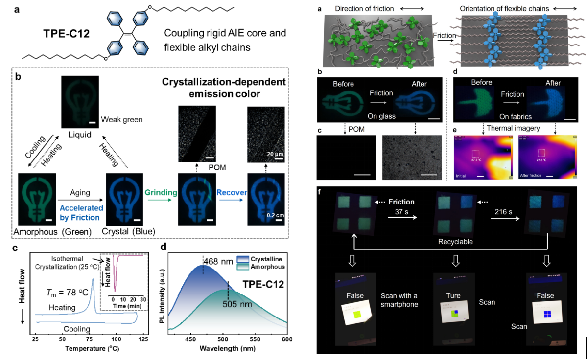 近年来,机械致变荧光(ML)材料逐渐成为化学与材料科学领域的研究重点,然而开发高灵敏度ML材料仍然是一项重要挑战。为此,公司先进聚合物和表界面材料团队发展了“摩擦诱导结晶”策略,开发了一类新型高灵敏度ML材料。这一新材料采用了一种具有刚性四苯乙烯(TPE)核心和两个长柔性烷基链的荧光分子(TPE-C12)。分子柔软性与刚性的平衡赋予TPE-C12滞后结晶动力学和结晶依赖的发光特性。更重要的是,通过施加剪切摩擦,可以显著加速TPE-C12的结晶过程,从而展现出高灵敏度ML特性。通过理论计算揭示原理:由于结晶TPE-C12具有紧凑的分子间堆积,其中的非常稳定分子间相互作用会限制激发态能量的弛豫路径,导致产生更大的能级间隙和蓝移发光。而且,这种具备“摩擦诱导结晶”特性的高灵敏度ML材料被成功应用于多级信息加密的摩擦解码。这项工作通过分子级运动的精确调控构筑了高灵敏度ML材料,有望带动下一代信息防伪光学材料的设计开发与工程应用。