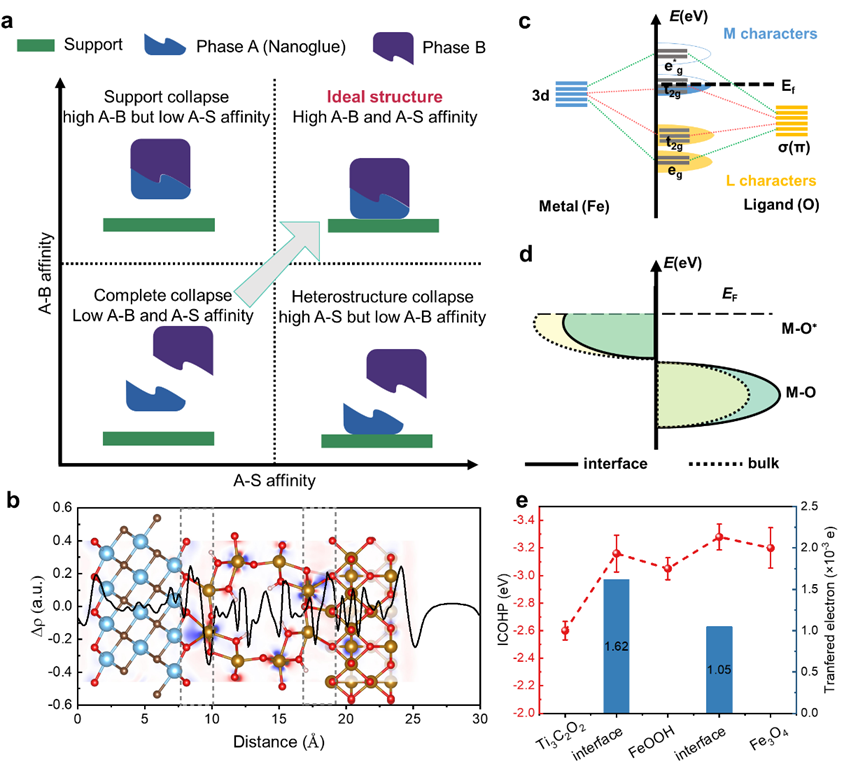 MXene由于较高的导电性、亲水性和机械强度,在锂离子电池、超级电容器、燃料电池等储能领域具有极大的应用前景。作为锂电池负极材料时,Li阳离子可以在MXene之间进行有效的脱嵌,表现出赝电容行为。然而,在循环过程中MXene会自发塌缩和堆垛,进一步阻碍锂离子的传输。本研究提出了一种利用界面来增强基底和异质结相之间结合的高效策略,以提高整体结构的稳定性。这种设计不仅产生了丰富的异质结和连续的离子/电子传输通道,还保持了出色的电化学可逆性。