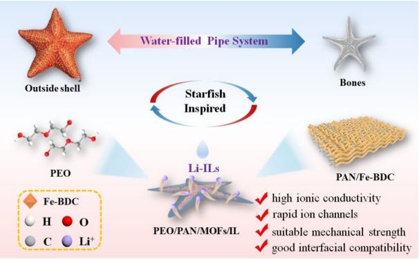 为突破这一局限,研究团队从海星的独特结构--柔软外表与坚硬骨架结构汲取灵感,创新性地采用静电纺丝技术,设计出多功能“海星型”复合聚合物电解质(CPEs)。这一设计巧妙地融合了聚丙烯腈/金属有机框架/离子液体(PAN/MOFs/ILs),构建出三维刚性骨架网络,为锂离子传输形成了连续且高效的传输通道:MOFs赋予骨架刚性,PEO作为缓冲外层提升界面相容性,而ILs则有效降低界面电阻,加速了锂离子的传输。制备的CPEs展现出良好的物理化学性能:优异的离子电导率、宽广的电化学窗口、均匀的锂离子通量以及高迁移数。这些协同优势在Li/CPEs/Li对称电池中得到了充分验证,该电池在1300多小时内展现出优秀的抑制枝晶生长能力。更有意义的是,在LiFePO4/CPEs/Li全电池应用中,经过2100次循环后,电池容量保持率高达90.1%。